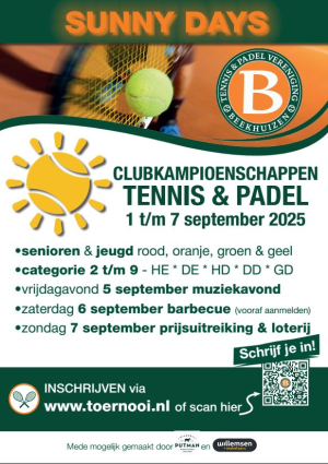 De inschrijving voor de Clubkampioenschappen 2025 is open. Hoe dan ook, het worden Sunny Days want meedoen en plezier hebben is belangrijker dan winnen. Speel je najaarscompetitie? Dan is dit gezellige toernooi dé ideale voorbereiding samen met je teammaatjes. Inschrijven is gratis en kan tot en met zondag 24 augustus.