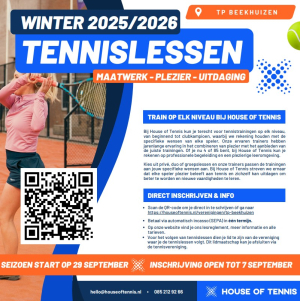 Tennislessen bij TP Beekhuizen worden verzorgd door House of Tennis. Bij House of Tennis kun je terecht voor trainingen op elk niveau: van beginnend tot clubkampioen. Daarbij houden we rekening met specifieke wensen van de speler. Onze trainers hebben jarenlange ervaring. En of je nu 4 of 85 bent, zij weten elke keer weer plezier te combineren met het geven van de juiste trainingen.