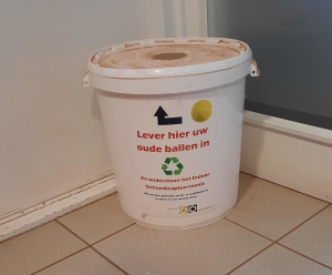 In de hal tussen clubhuis en buitenbanen staat een witte ton. Daarin kun je jouw gebruikte oude tennis- en padelballen kwijt.