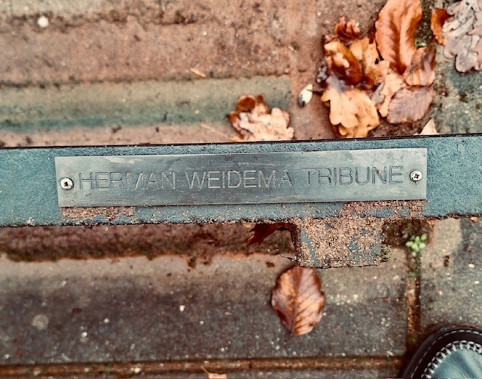 Na het lezen van mijn verhaal sprak Harry Beek mij aan dat het plaatje (zie foto) wel degelijk bewaard was gebleven. Hij heeft het destijds na de renovatie van het terras teruggeplaatst. Na enig speurwerk heb ik het inderdaad gevonden op de achterkant van één van de onderste (losliggende) houten zitplaatsen bij baan 1. Omdat het plaatje verkleurd is in de loop der jaren valt het eerbetoon aan Weidema niet op. Dat zou beter moeten kunnen!