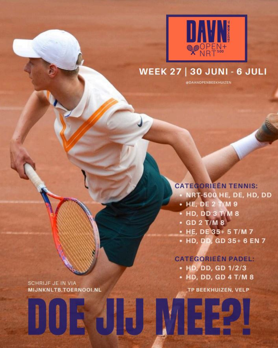 Vanaf vrijdag 27 juni is het anderhalve week lang weer volle bak op ons park! Het jaarlijkse DAAN Open met Nationaal Ranglijst Toernooi én Junioren Tour Toernooi wordt dan georganiseerd. Ook dit jaar zetten we weer in op meer dan 500 deelnemers in de categorieën 1 t/m 9 voor tennis en padel. Heb jij je nog niet ingeschreven? Doe dat dan uiterlijk zaterdag 21 juni om verzekerd te zijn van een plekje. De afgelopen jaren is de inschrijving regelmatig eerder gesloten dus wacht vooral niet te lang met inschrijven. Geen zin om deel te nemen maar wel om te komen kijken? Tijdens het DAAN Open wordt er tennis en padel op topniveau gespeeld, er is een lekker weekmenu en de commissie zorgt op veel avonden voor hapjes. Ook kunnen we hulp in de horeca heel goed gebruiken. Heb je nog niet aan de vrijwilligersuren voldaan? Meld je dan vooral aan via de Clubapp om te helpen tijdens dit mooie evenement.