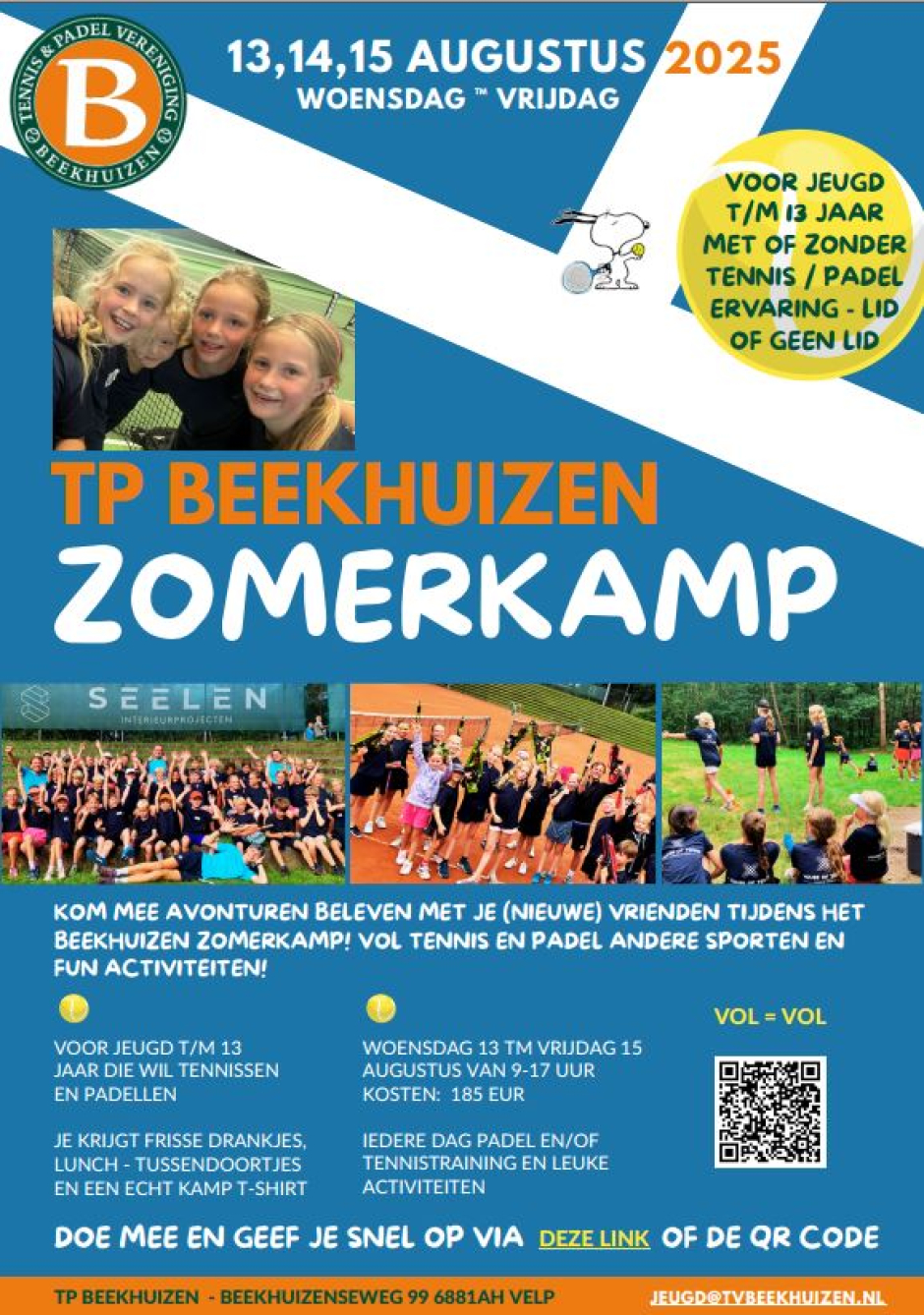 Zin in een sportieve en gezellige zomer? Meld je aan voor ons 3-daagse zomerkamp van 13 t/m 15 augustus! Dit kamp zit boordevol tennis, padel én een hoop leuke andere activiteiten. Of je nu al ervaring hebt of juist net begint, iedereen van 5 t/m 13 jaar is welkom!