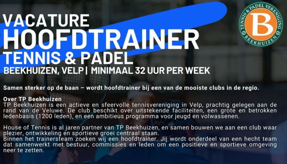 Vacature hoofdtrainer Tennis & Padel