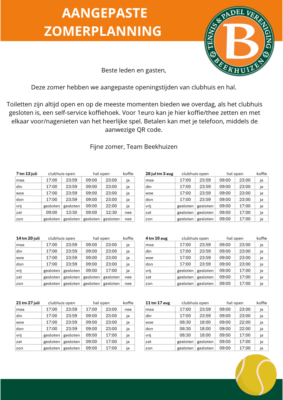 Aan het einde van dit jaar zit mijn termijn van 3 jaar als voorzitter van Beekhuizen erop. Ik heb recent besloten om mij niet herkiesbaar te stellen voor een volgende termijn. Mijn betrokkenheid bij Beekhuizen blijft de komende jaren groot maar nog eens meerdere jaren als voorzitter kan en wil ik niet meer combineren met allerlei andere bezigheden. Dat betekent dat we in aanloop naar de ALV van december op zoek zullen moeten gaan naar een nieuwe voorzitter. Ook Leander heeft recentelijk aangegeven dat hij na vijf jaar stopt in het stichtingsbestuur. Leander heeft zich de afgelopen jaren ongelofelijk hard ingezet voor de exploitatie van de hal, de horeca en allerlei andere zaken rondom grootschalig onderhoud. We hebben al meermaals oproepen gedaan voor nieuwe bestuursleden. Deze prachtige tennis- en padelvereniging zijn we met alle 1200 leden! Laten we dat ook met elkaar uitdragen de komende jaren. Hierbij dus nogmaals de oproep voor bestuursleden in het verenigings- en stichtingsbestuur. Heb je vragen over een mogelijke rol in het bestuur? Meld je dan alsjeblieft want goede hulp kunnen we héél erg goed gebruiken!