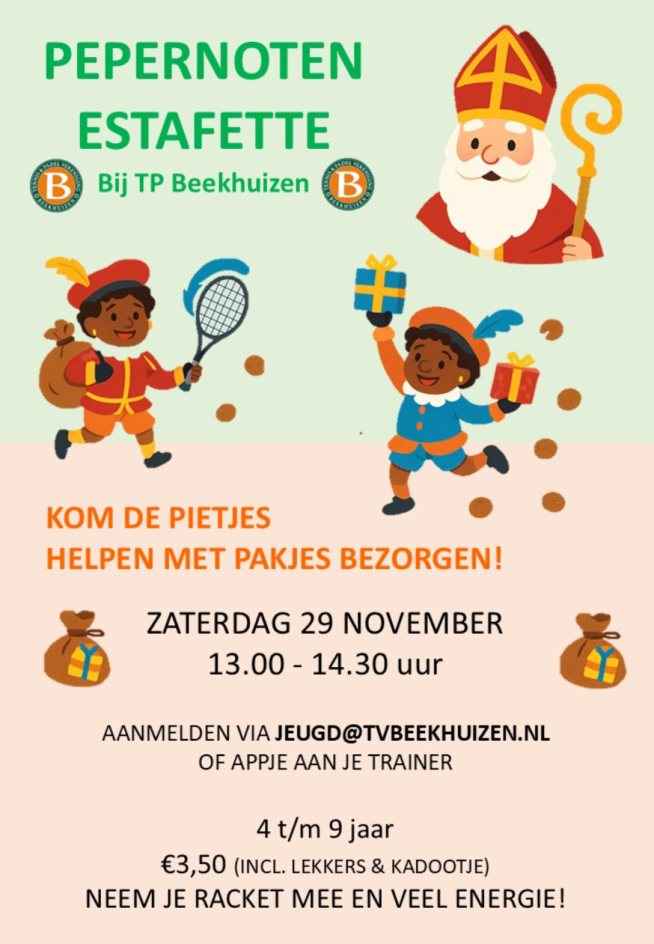 Onze jeugdcommissie zorgt ook dit jaar weer voor feestelijke activiteiten. Voor onze jongste spelers van 4 t/m 9 jaar staat op zaterdag 29 november de vrolijke Pepernotenestafette op het programma. En voor de jeugd van 6 t/m 17 jaar, organiseren we op zaterdag 3 januari het altijd gezellige Oliebollentoernooi—een sportieve en smakelijke start van het nieuwe jaar!